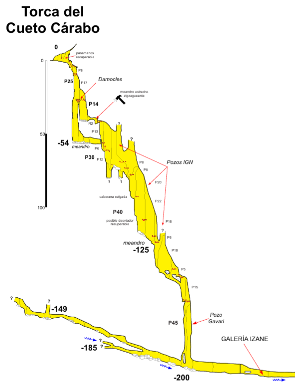 - Punto clave: Rápel encadenado en cabecera colgada en el P40 de los Pozos IGN