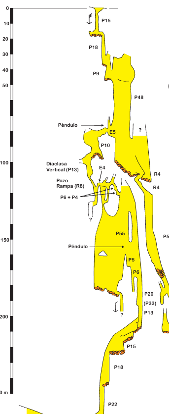 Al ser una travesía en la que se entra por una sima y se sale a superficie por la Cueva de Cañuela o Cayuela, se alcanza la cota de la de la misma y se sigue el curso del Río Valpoquero al exterior sin hondar más profundidad.