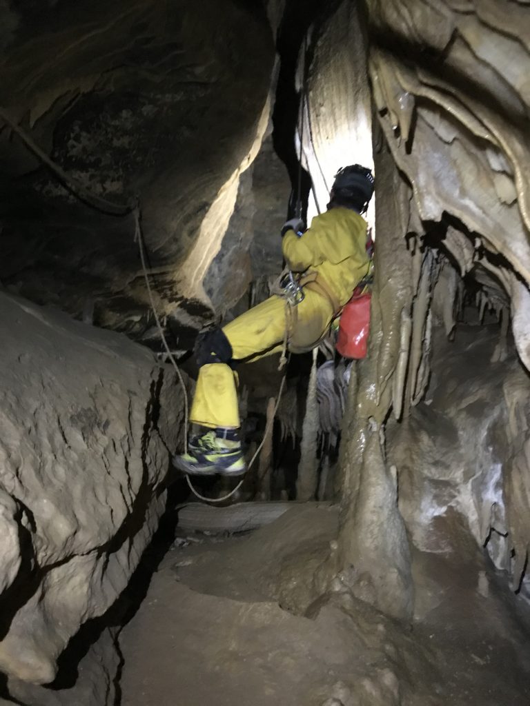 Nada más entrar se comienza progresando por pasamanos, rapelando pozos y atravesando salas donde una concatenación de diaclasas verticales nos pondrá a prueba al rapelar entre ellas .